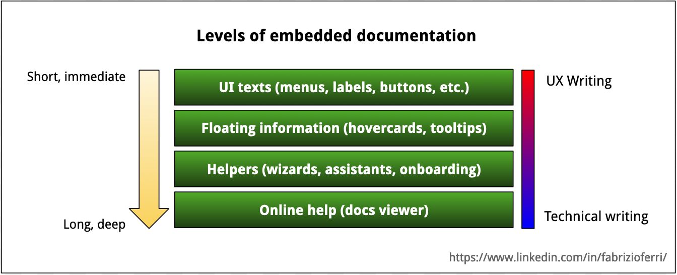 When a tech writer works on embedded documentation, they can form strong partnership with designers and UX writers. A way of thinking about the difference between UX writers and technical writers is picturing the former as the front end and the latter as the back end of product knowledge and language.