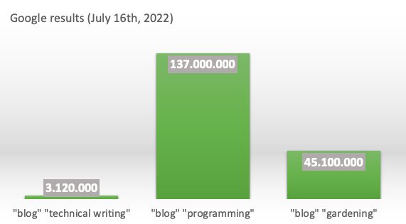Does that alone explain why there are fewer blogs on technical writing? I’m not sure. Other issues might be at play, such as the lack of cohesion when it comes to terminology (is it “tech writing” or “tech comms” or “content strategy”?), as well as dominance of programming content over other types of content. It might be that technical writing blogs are just hard to come by, possibly owing to a low popularity / high scarcity combo.