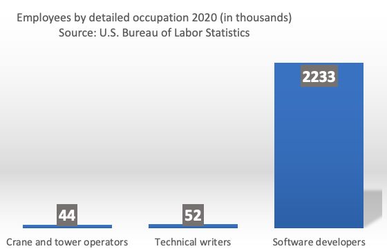 According to the U.S. Bureau of Labor Statistics, there are 52 thousand technical writers working in the United States as of 2020, whereas software developers number 2.2 million employees, not counting hardware engineers. That’s a ratio of 43 developers per technical writer, which seems to relate to the proportions of blog content in Google.