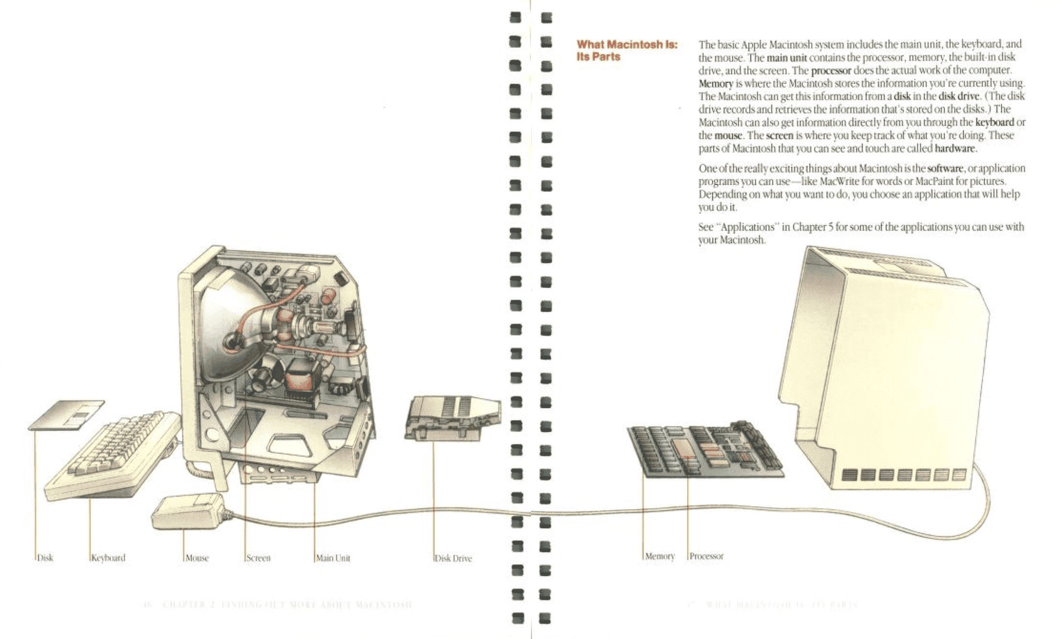 The original Macintosh manual (1984) uses brilliant illustrations to explain complex concepts and procedures. There’s very little text in it.